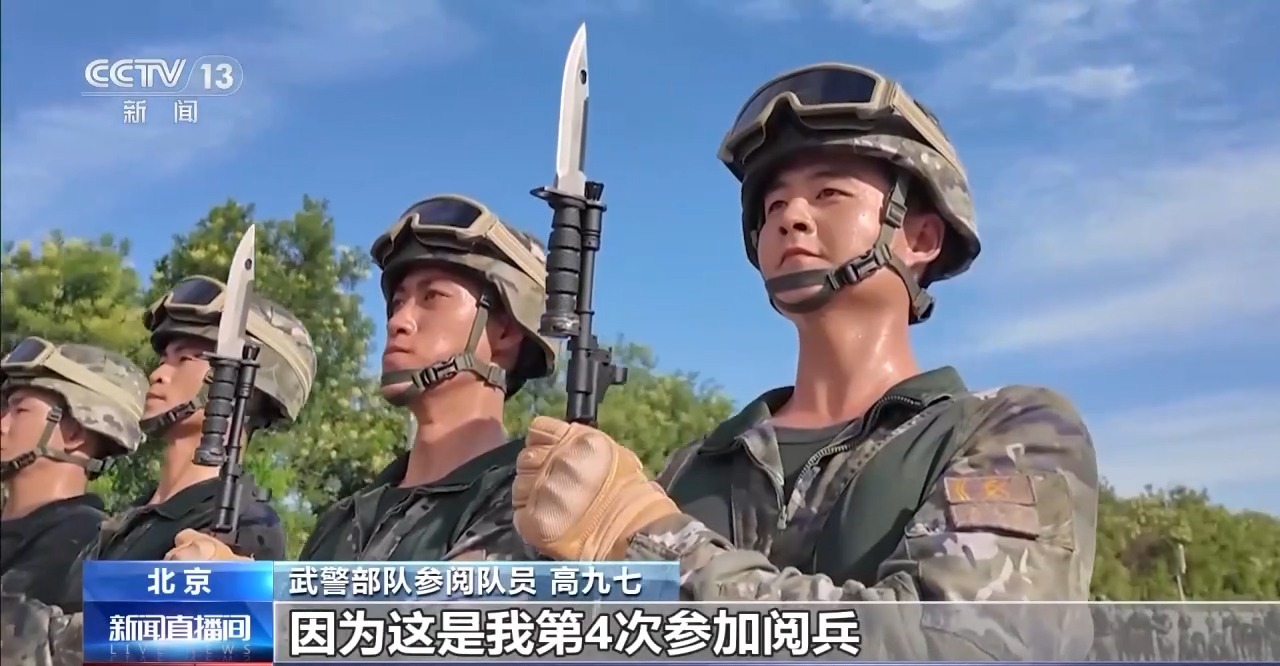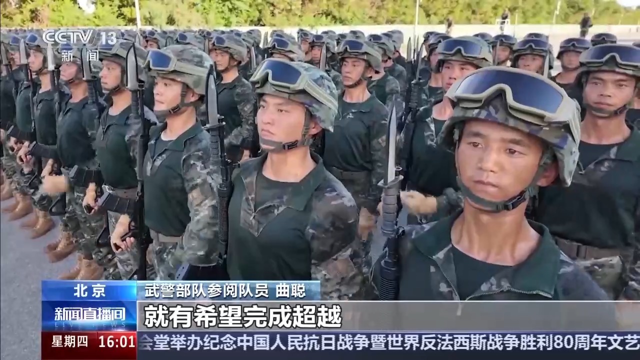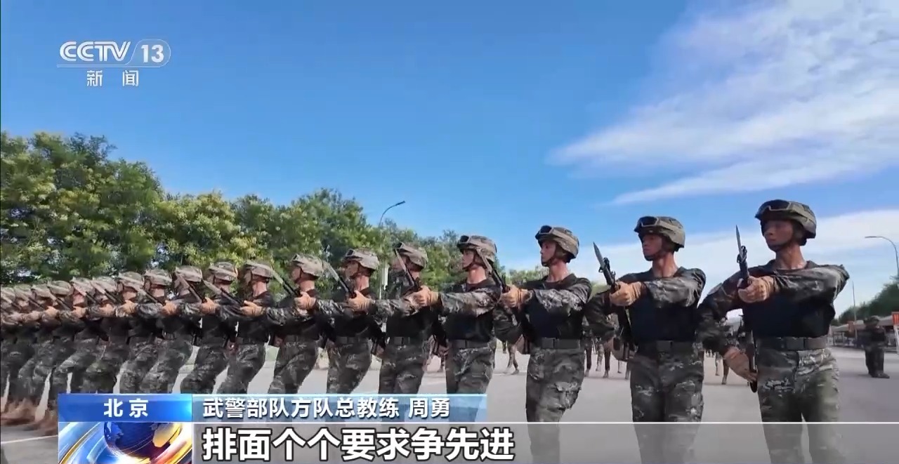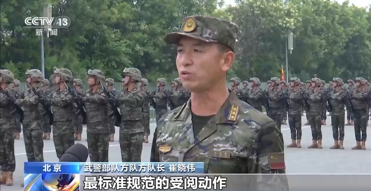 武警部队方队队长崔晓伟:目前我们已经进入最后的冲刺阶段,200多人没有基础,参加本次制度阅兵的武警官兵都来自一线任务,又吃不消,我妻子说了最让我感动的一句话,最规范规范的受阅活动,